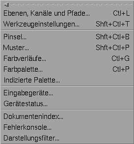 Unter anderem für Benutzer eines Apple-Computers, diese verfügen nur über eine Maustaste, wurde in Gimp 1.1 in der oberen linken Ecke die Möglichkeit geschaffen, mit der linken Maustaste auf das Menü zuzugreifen.