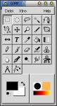 Die Werkzeugleiste von Gimp besteht aus drei Pull-Down-Menüs, vielen Icons sowie einer Fläche zur Farbauswahl und einer Fläche zur Musterauswahl.