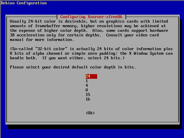 Abschließend können Sie noch die Farbtiefe des X-Servers wählen. Moderne Grafikkarten verfügen über ausreichend Speicher, um auch in hohen Auflösungen mit 24 Bit arbeiten zu können.